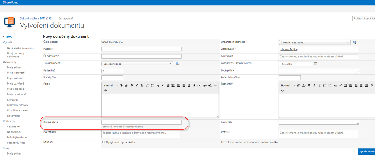 klíčových slov. Klíčové slovo je především to, co přímo charakterizuje obsah dokumentu a my jej můžeme doplnit u každého nově doručeného či vytvořeného dokumentu, případně jej do dokumentu můžeme doplnit později editací.