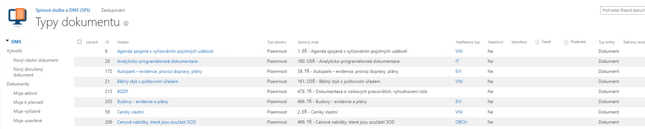 typu dokumentů. Stanovíme si jasná kritéria, pomocí kterých data členíme do jednotlivých skupin podle typů dokumentů. Na obrázku můžeme vidět příklad klasifikace dat podle typu dokumentů v DMS Ordinics: